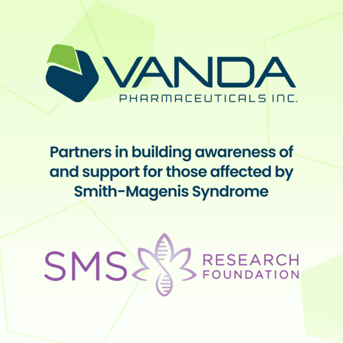 Vanda Pharmaceuticals is pleased to partner with the SMS Research Foundation for the Steps Move Science Virtual Walk. We are committed to developing essential new therapies to improve the lives of patients with non-24-hour sleep-wake disorder and nighttime sleep disturbances in SMS.